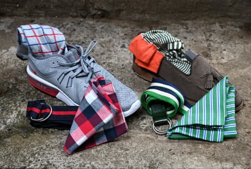 安藤「いつも3点を合わせることを意識しています。たとえはこのナイキのグレーのハイテクスニーカーの靴下はグレー地のチェック。合わせるチーフもチェックです。ベルトも同系色。グリーンのタッセルモカシン(房飾り『タッセル』がついた柔らかい革靴)にはグリーンの横じまの靴下、グリーンのチーフ、ベルトもその色を取り入れています」