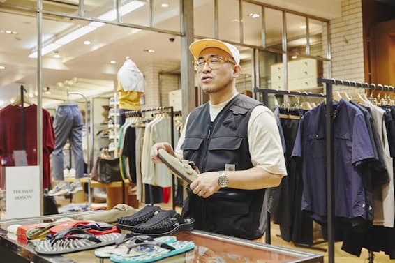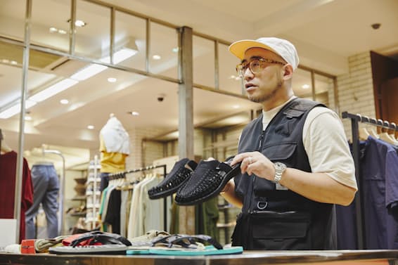 「革靴と相性のいいコーディネートに、あえてサンダルを合わせると個性のある着こなしに仕上がります」と板垣さん