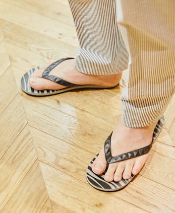 ハイアンのビーチサンダル(3850円)。パンツは今年のトレンドでもあるシアサッカー素材で、落ち着いたモノトーンのストライプ柄が、サンダルのゼブラ柄と合っている