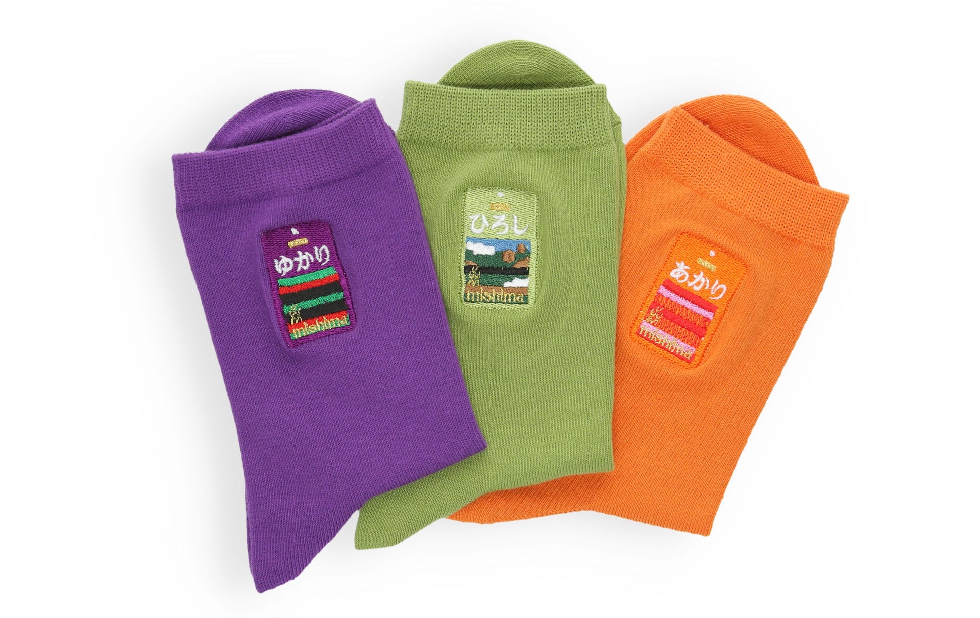 (「三島の『ゆかり』刺繍ソックス」/「三島の『あかり』刺繍ソックス」/「三島の『ひろし』刺繍ソックス」)