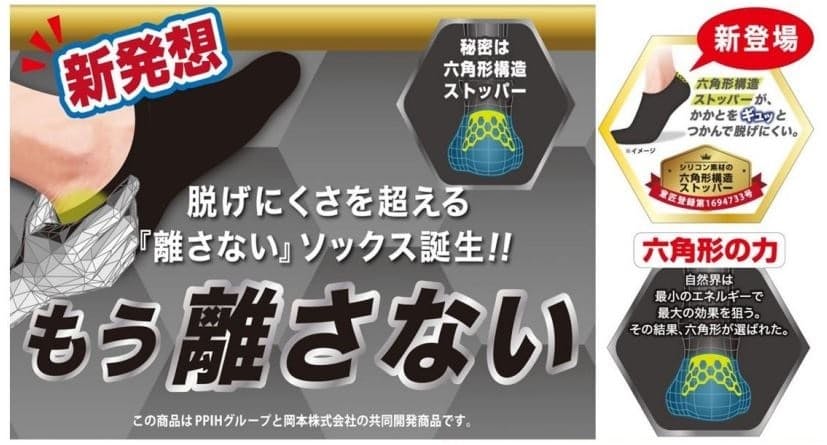 本商品はかかと部分にシリコン素材の六角形構造ストッパーが採用され、かかとをギュッとつかんでより脱げにくい構造です。従来の"脱げにくい"を超える、"もう離さない"仕様になっています。自然界でもハチの巣や、遺伝子など多く六角形が存在しており、最小のエネルギーで効率よく最大効果を発揮する形状と言われています。靴下の岡本による意匠登録が行われている、この構造を採用した本商品は、ドン・キホーテ限定販売の商品です。