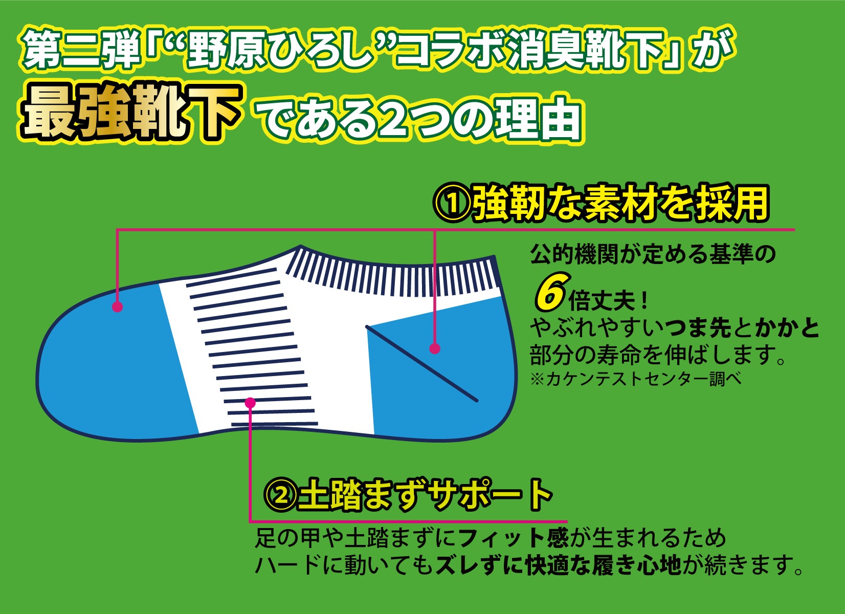 「“野原ひろし”コラボ消臭靴下」第二弾では、従来の優れた消臭機能はそのままに、タフな足の動きにも応えるべく、「丈夫さ」と土踏まずの「サポート機能」を施しました。