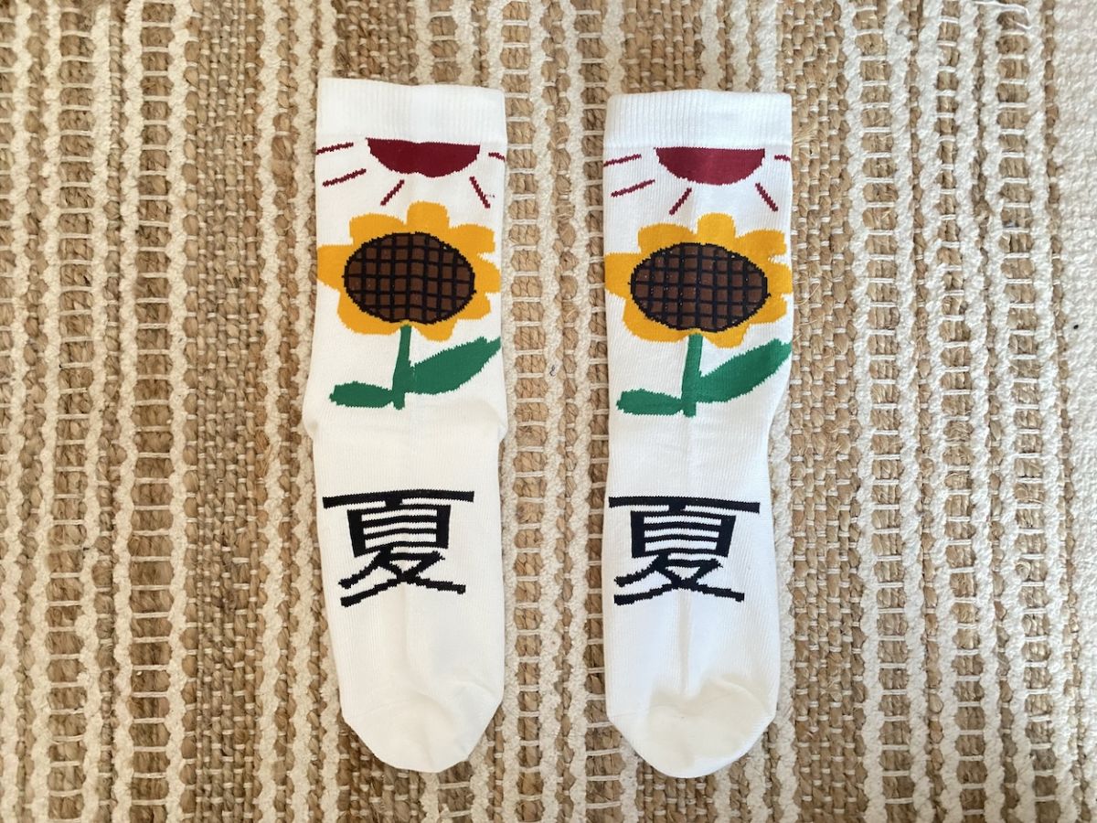 そして、完成した靴下がこちら!ひまわりだけでは物足りないと思い、甲の部分にプラスした「夏」の文字がインパクトのある個性的な靴下に仕上がったと思います。お店では絶対に販売されない靴下を作れるのも魅力ですね。