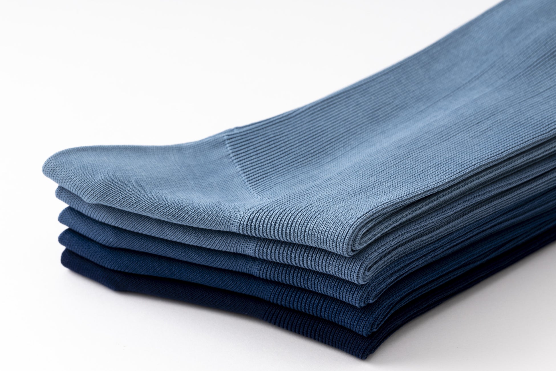 技術の難しさから、靴下ではムラ染めが主流の藍染を、渡邉氏の高度な技術により均一に染めた藍色、しかも5色のグラデーション展開は、またとない逸品です。何度も履き続け、洗う中でその色はさらに変化していき、その過程も楽しむことができます。