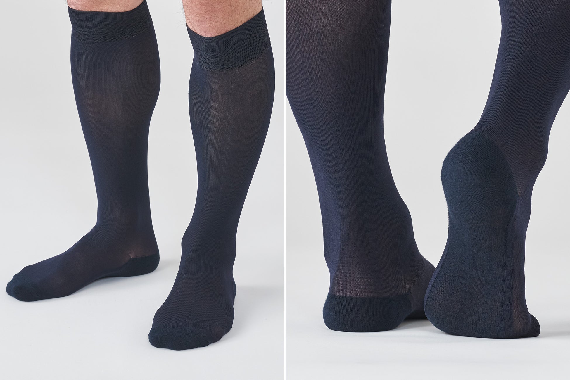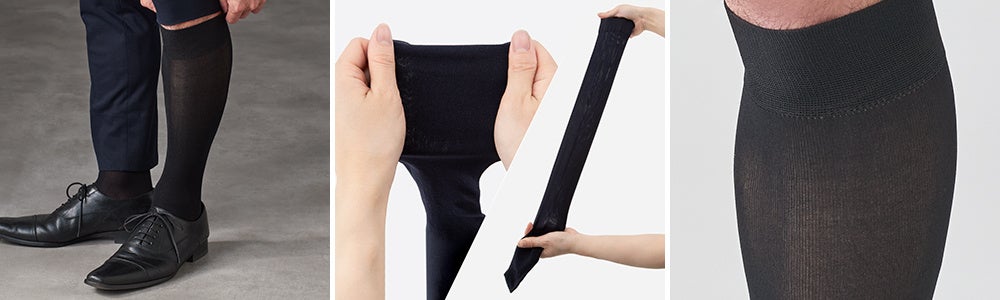 色は、ブラックとネイビーの2色で、ビジネスシーンや冠婚葬祭に必須のフォーマルなカラー。素材は、ふんわりと伸びの良いナイロン生地で、汗や強度が気になるつま先、かかと、足底は、抗菌防臭&消臭加工コットン糸を使用。長さは、脚を組んでもスネが見えないようにロングホーズ丈を採用し、1日履いてもズレ落ちることがなくストレスフリーなのも特徴です。